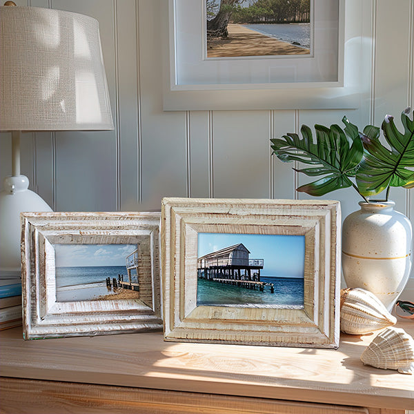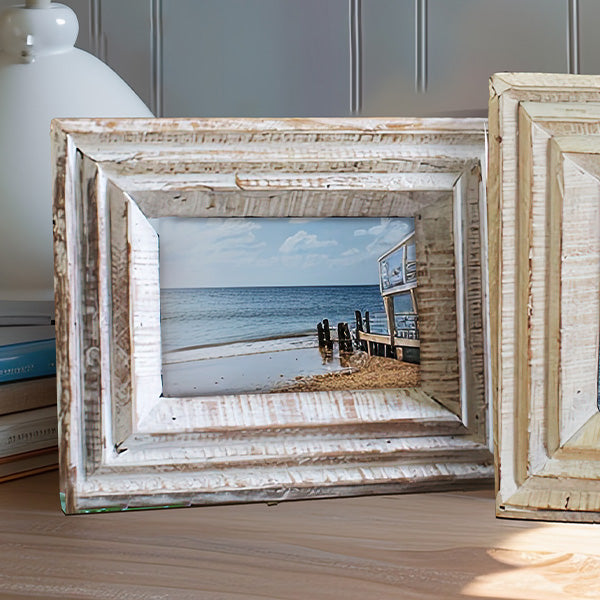 Enhance your décor sustainably with our Recycled White Washed Wood Frames, Set of 2, perfect for showcasing cherished memories. Crafted from reclaimed wood with a charming white washed finish, these frames add rustic elegance to any space. Whether displayed on a mantel, shelf, or gallery wall, they provide a stylish backdrop for your favorite photos or artwork, infusing your home with eco-friendly charm and timeless appeal.