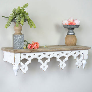 Whether you are drawn to the beautifully intracate scalloped edge or the distressed white chippy wood detail this vintage inspired wall shelf will add charm to any space!
