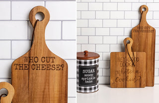 Bring an amusing rustic accent into your space with our Wooden Who Cut The Cheese Cutting Board. Made with a natural wood finish this paddle-shaped wall décor features a humorous quote and a leather hanger for displaying in your farmhouse kitchen.