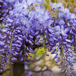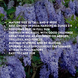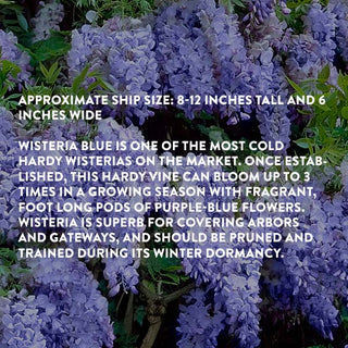 Wisteria Blue is one of the most cold hardy wisterias on the market. Once established, this hardy vine can bloom up to 3 times in a growing season with fragrant, foot long pods of purple-blue flowers. Wisteria is superb for covering arbors and gateways, and should be pruned and trained during its winter dormancy.