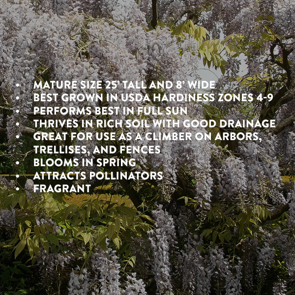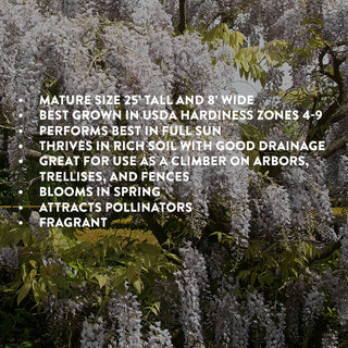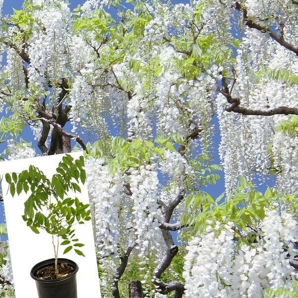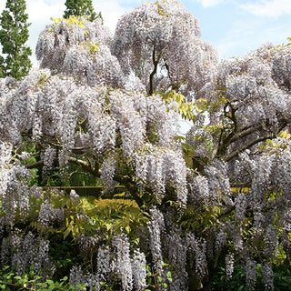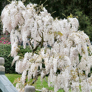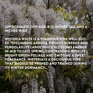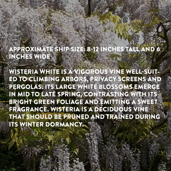 Wisteria White is a vigorous vine well-suited to climbing arbors, privacy screens and pergolas. Its large white blossoms emerge in mid to late spring, contrasting with its bright green foliage and emitting a sweet fragrance. Wisteria is a deciduous vine that should be pruned and trained during its winter dormancy.