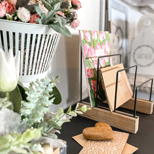 This table-top mail, cards, bills and/or napkins holder organizes your papers and reduces the height of your piles in STYLE! This will even be the perfect thing to hold all of your holiday cards this season! It's all in the details isn't it?!