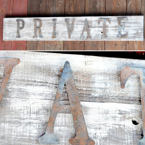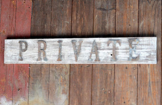 Love at first sight!! That is exactly how we felt when we laid eyes on this AHHmazing tin letter private sign! The aged tin mixed with that perfectly aged wood is sure to add that farmhouse flare to any home!