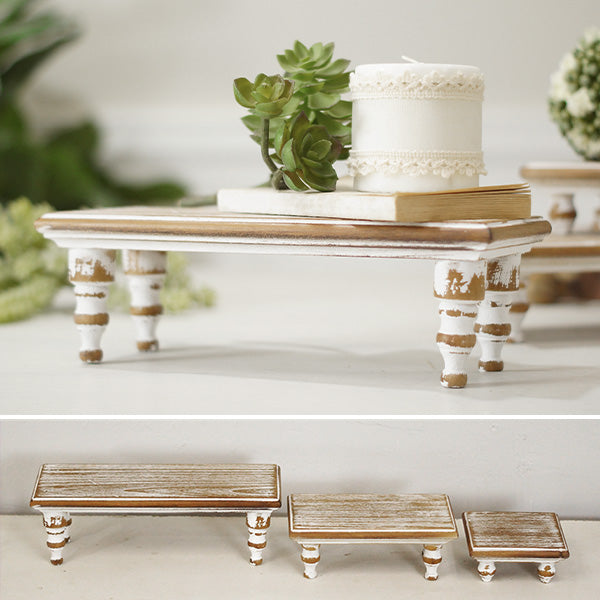 Transform your decorative vignettes with our set of three Vintage Inspired Wood Tabletop Risers! Crafted with meticulous attention to detail, these risers boast a classic design complemented by a distressed white finish, exuding timeless elegance and vintage allure. Their distressed look not only adds character but also lends a touch of rustic charm to your home decor.