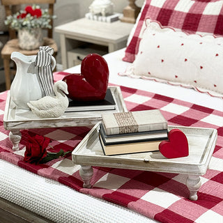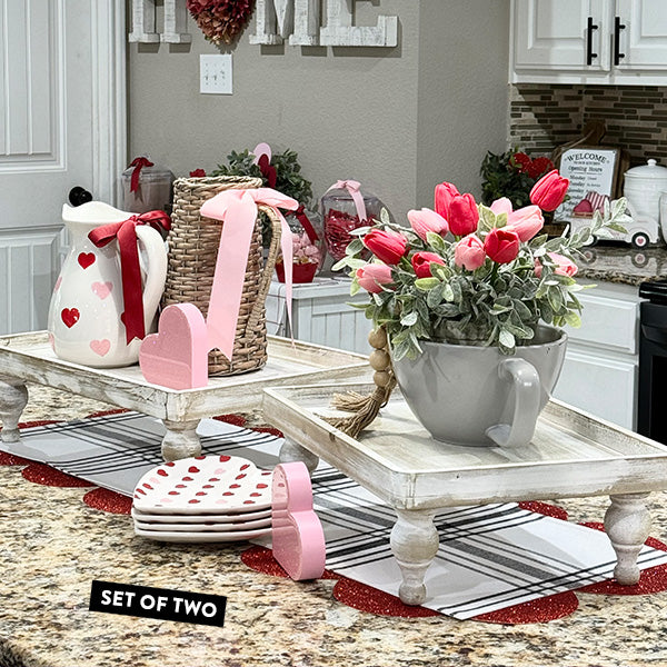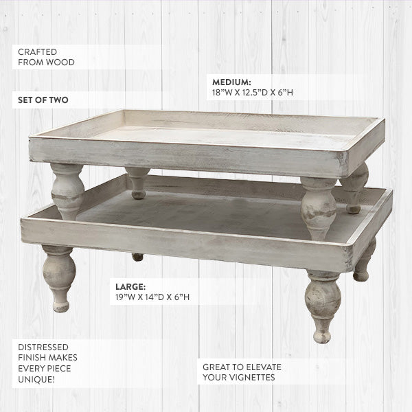 Take your decorative vignette to new heights with our Distressed Wood Trays with Turned Legs. Featuring a classic design in a whitewashed, distressed finish and decorative turned legs, these wooden risers will fill your home with vintage-inspired charm while adding extra dimension as well.