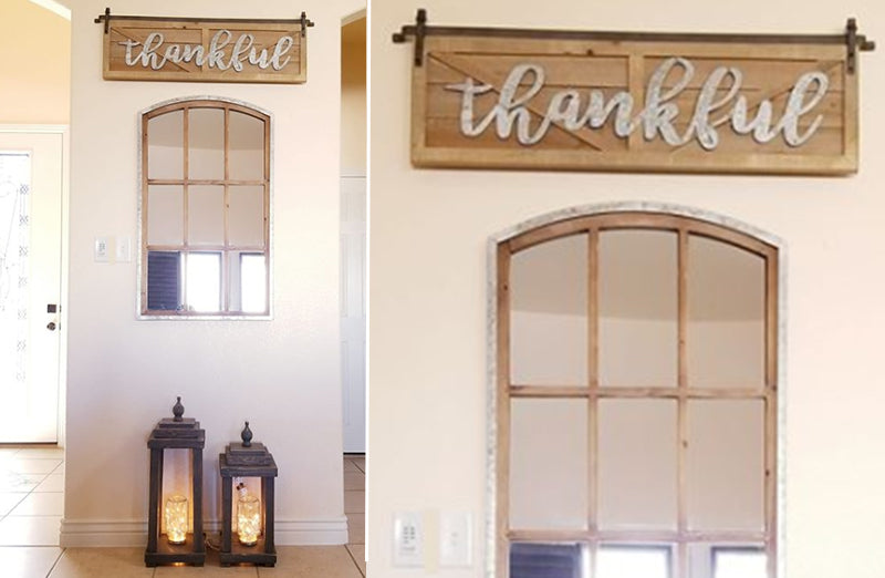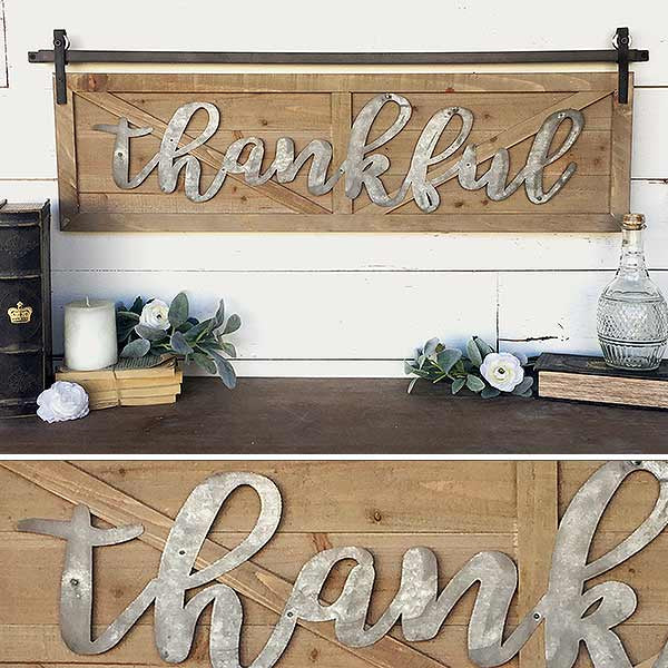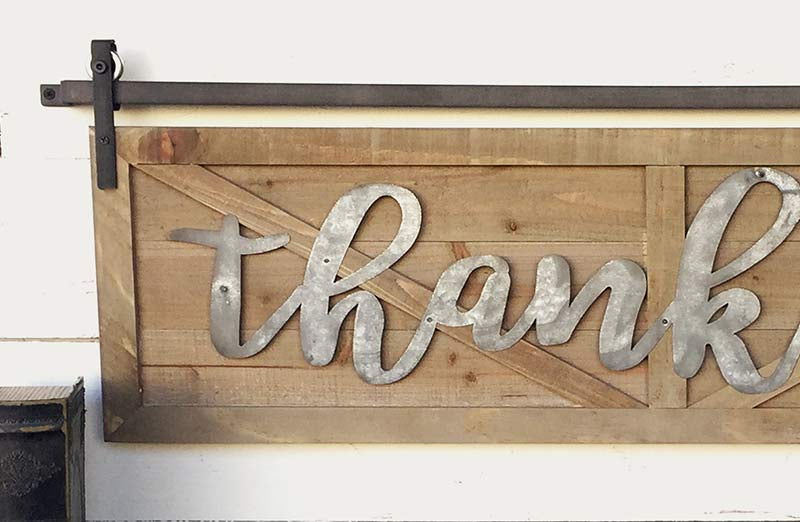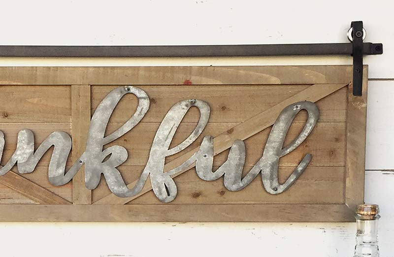 This wooden barn door inspired sign is the perfect addition to your home decor and especially around the holiday season! The galvanized metal decorating the natural wood is a great reminder to stay "Thankful"!