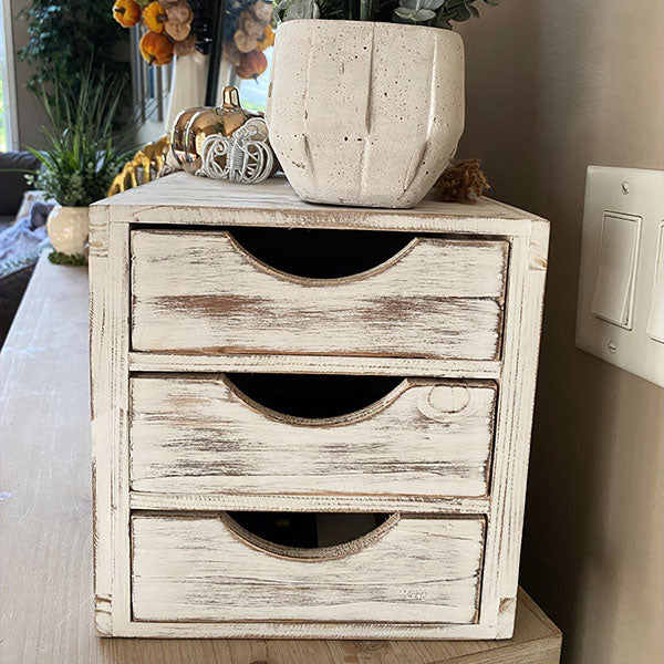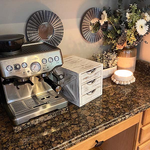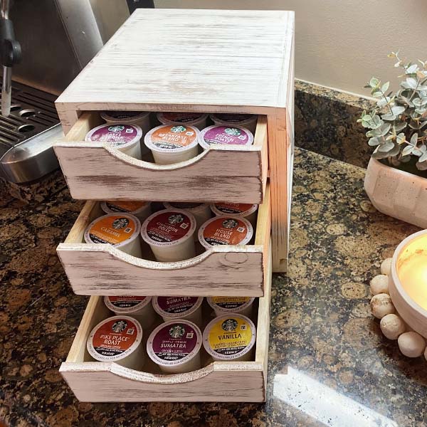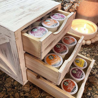 It's perfect for displaying your favorite Keurig K-cups, tea bags, creamer cups, hot chocolate packets and other small kitchen goodies! Not only is this piece super functional and great for storage but it's such a simple way to create a farmhouse cottage look! You are going to LOVE how this transforms the look of your coffee station! And don't stop there.... this would also be a perfect storage solution for your office, craft room or ANYwhere!
