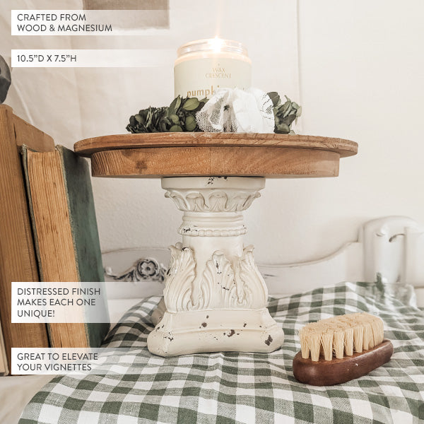 Enhance your home decor with the elegance and functionality of our Distressed Wooden Cake Stand with Architectural Base, a versatile piece that adds charm and sophistication to any setting.