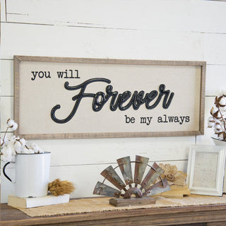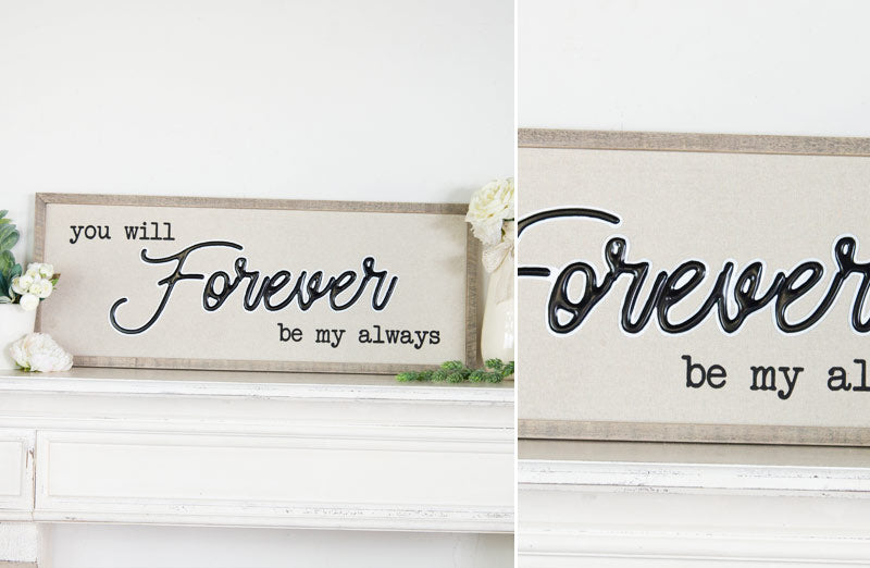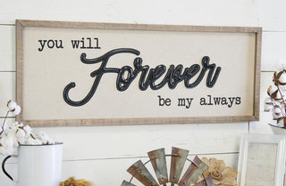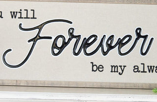 This LARGE 36" sign will look great in your living room breakfast nook TV room or dining room! It's perfect and the "you will forever be my always" is such a beautiful saying and you will love being reminded of this every time you see it.