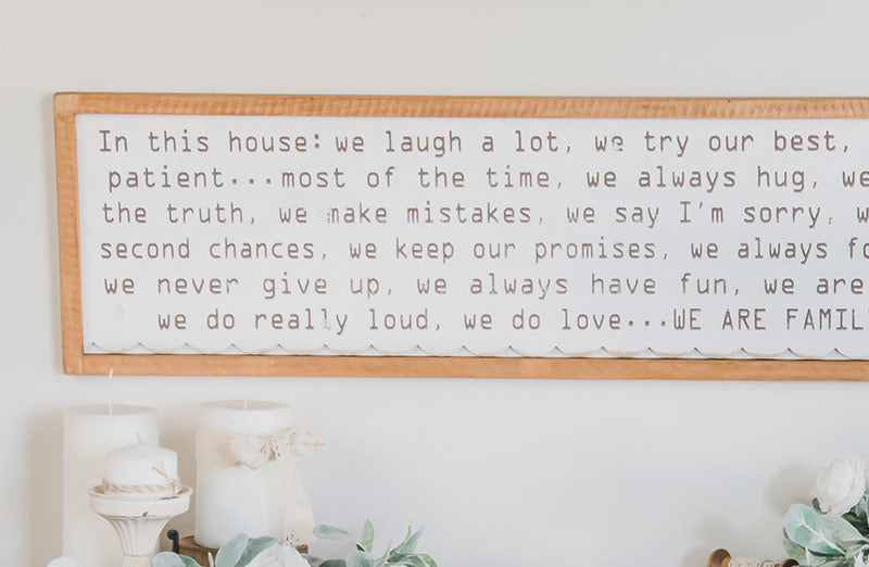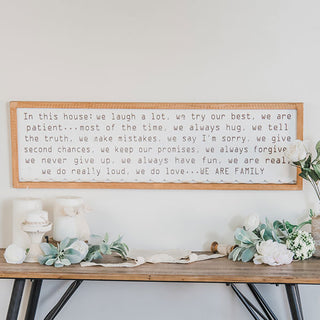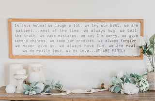 This large reverse canvas sign has a popular fun quote waiting to greet your guest and let them know how fun-filled your family is. This piece is STUNNING and its gorgeous design and versatility allow you to place in any room of the house. It would be the perfect piece to display in your entryway your bedroom nursery guest room kitchen. Literally anywhere! We love black and white with natural wood tones. It makes it the perfect addition to any farmhouse or vintage lover home!