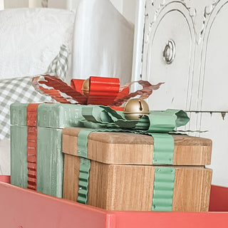 Enhance your holiday display with our Wooden Gift Boxes with Iron Bows, Set of 2. These beautifully crafted boxes feature rustic wood and elegant iron bows, adding a timeless and festive touch to your seasonal decor.