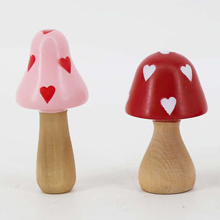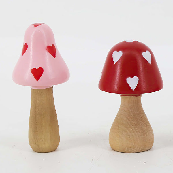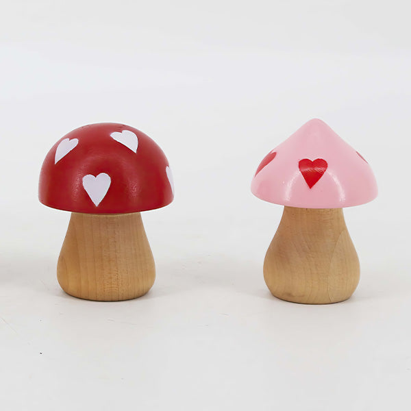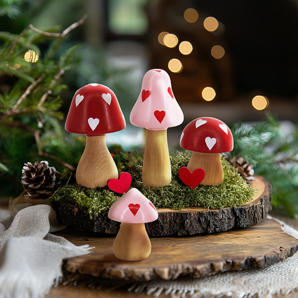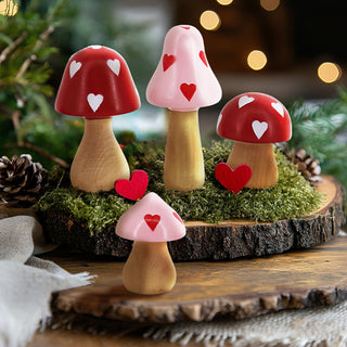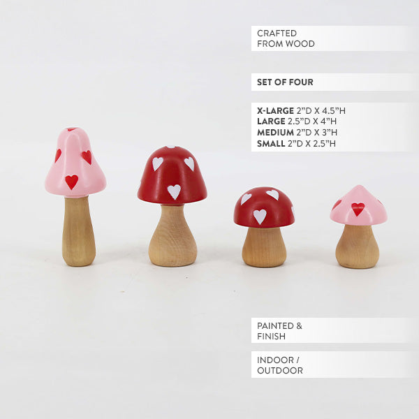 - Set of Four: Includes four beautifully crafted wooden mushrooms, each with a distinct heart-patterned cap.