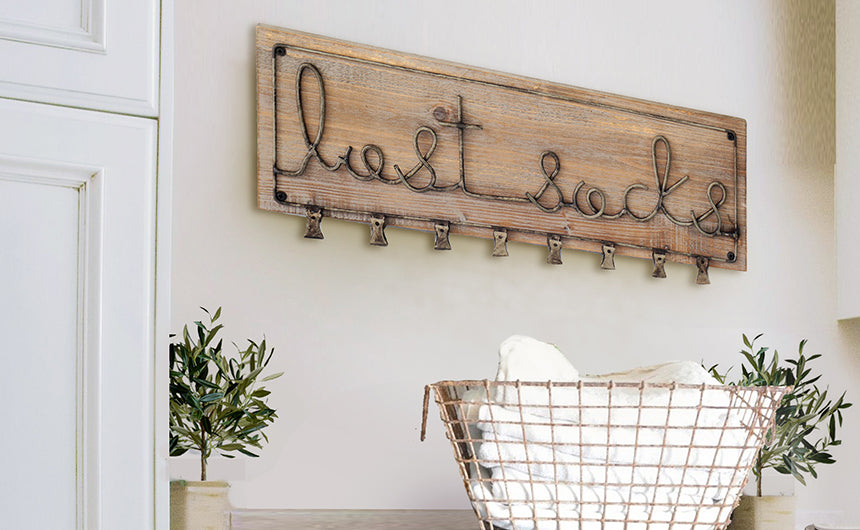 This distressed wood sign is just so perfect for any type of decor and we are truly in LOVE! Distressed in design and unique in style this vintage Lost Socks sign will add a little charm to any space AND create a handy space to hold all those lost socks! LOL