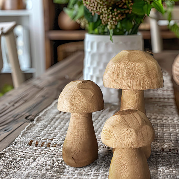 Natural Appeal: Crafted from wood, these mushrooms capture the essence of the outdoors with their natural appeal. They bring a sense of wanderlust and nature-inspired beauty to any corner of your home.