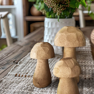 Introducing our Whimsical Wooden Mushrooms, Set of 3 – the perfect boho-inspired addition to infuse character into your vignettes and bring a touch of nature's charm to your decor.