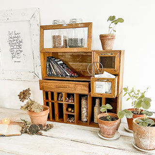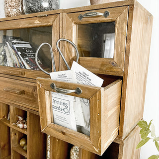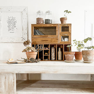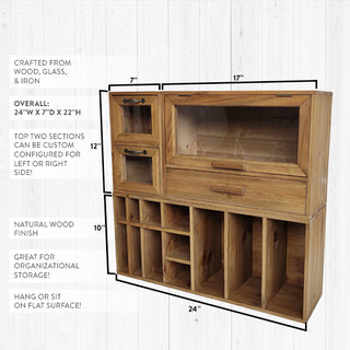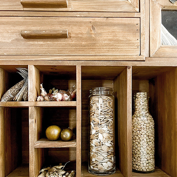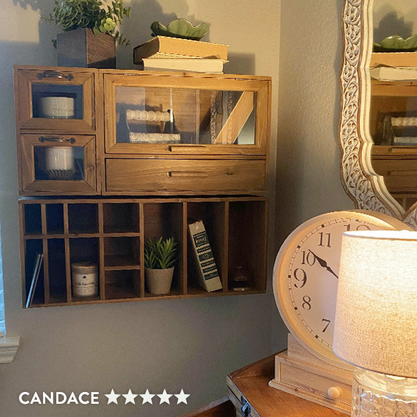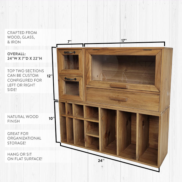 This smartly designed Wooden Organizer features shelves, drawer, cubbies and cabinets! SO many storage options... AND this can hang on the wall OR sit on any flat surface! You'll love this MULTIPURPOSE piece that comes with tons of storage space for all of your organization needs! Keep your space clutter-free while adding some vintage farmhouse charm.