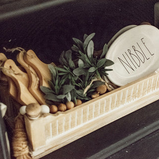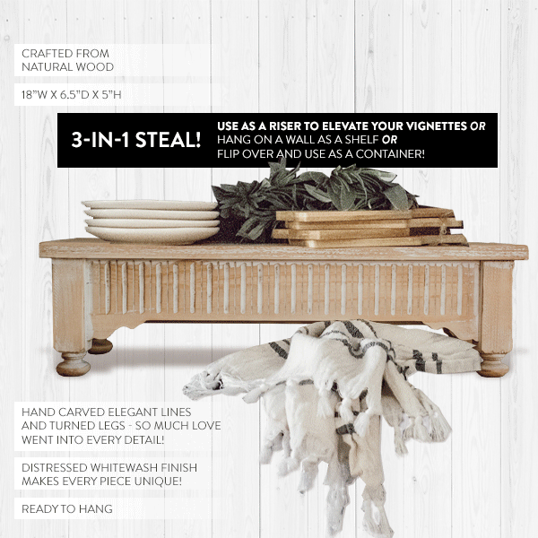 THREE STEALS IN ONE?! We are in! This Wooden Riser Wall Shelf comes ready to hang as a beautiful carved floating shelf OR can sit flat on a tabletop as a perfect wooden riser OR can be turned over and used as a unique tray! Use it how you want it, either way it will be AMAZING in your space!