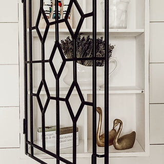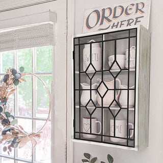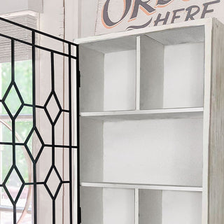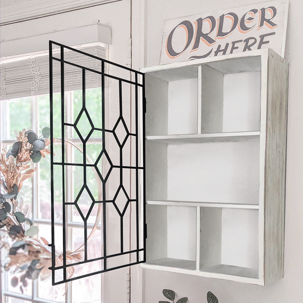Our Wooden Wall Hanging Curio Cabinet with Black Iron Door is farmhouse vintage at its finest! Made from distressed wood and metal framing, this cabinet is made to resemble old stained glass window frames. We LOVE that this particular style has an open style door with no glass... even easier to see all the treasures you display inside!