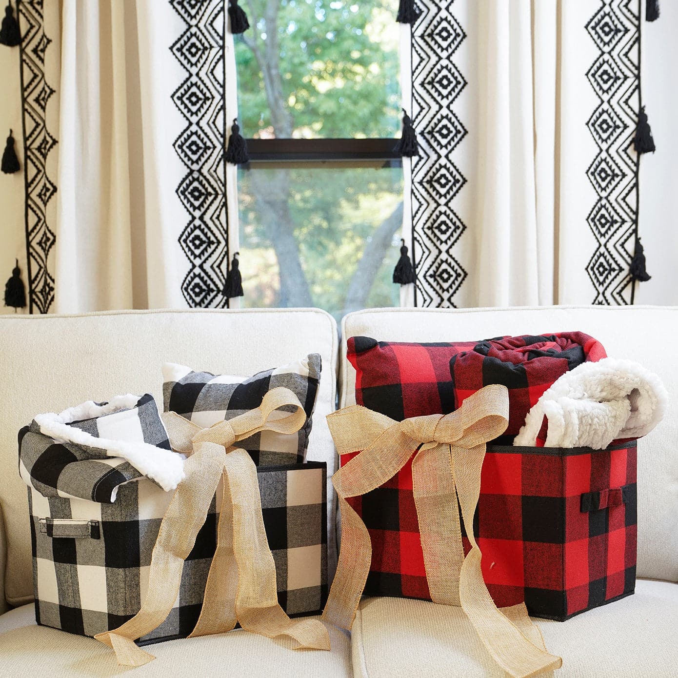This stylish and functional Woven Buffalo Check Gift Set includes matching collapsible storage box, throw pillow and Sherpa-lined throw blanket. It makes a great gift for your mom, your sister, or anyone on your list who likes to be cozy and comfortable. Decorative ribbon is included in the package for easy gifting.