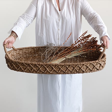 Use this seagrass tray on your coffee table to display your favorite photo albums and to collect your remotes! We can see this being used as a breakfast tray for weekend “breakfast in bed” days! Use this as part of a centerpiece on your dining room table! Style this in your kitchen to display your fresh produce! This tray is so BEAUTIFUL is dripping with farmhouse charm!